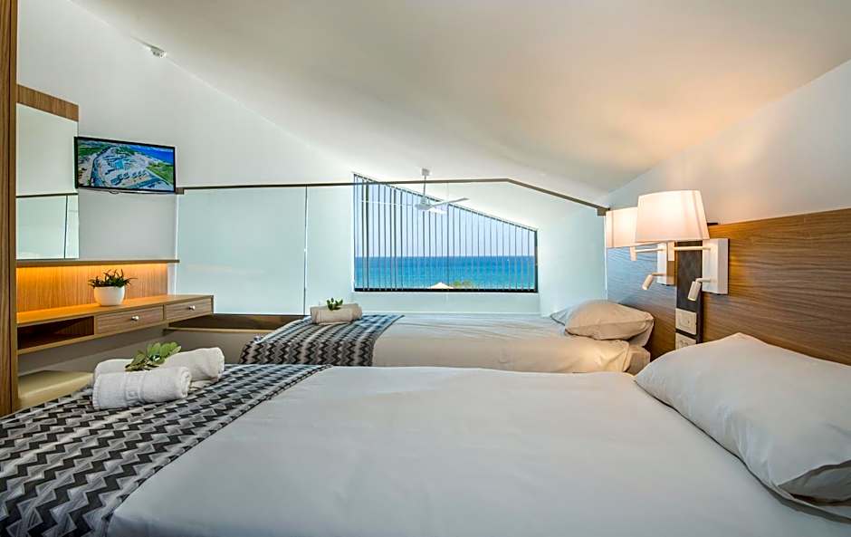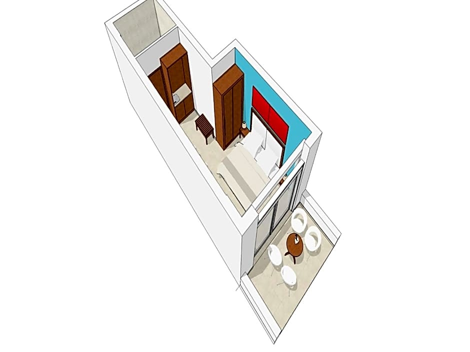 MAISONETTE SEA VIEW is 463 square feet and includes either a double bed 131-150 width or 2 single beds 80-130 width plus a sofa bed plus extra beds on demand.